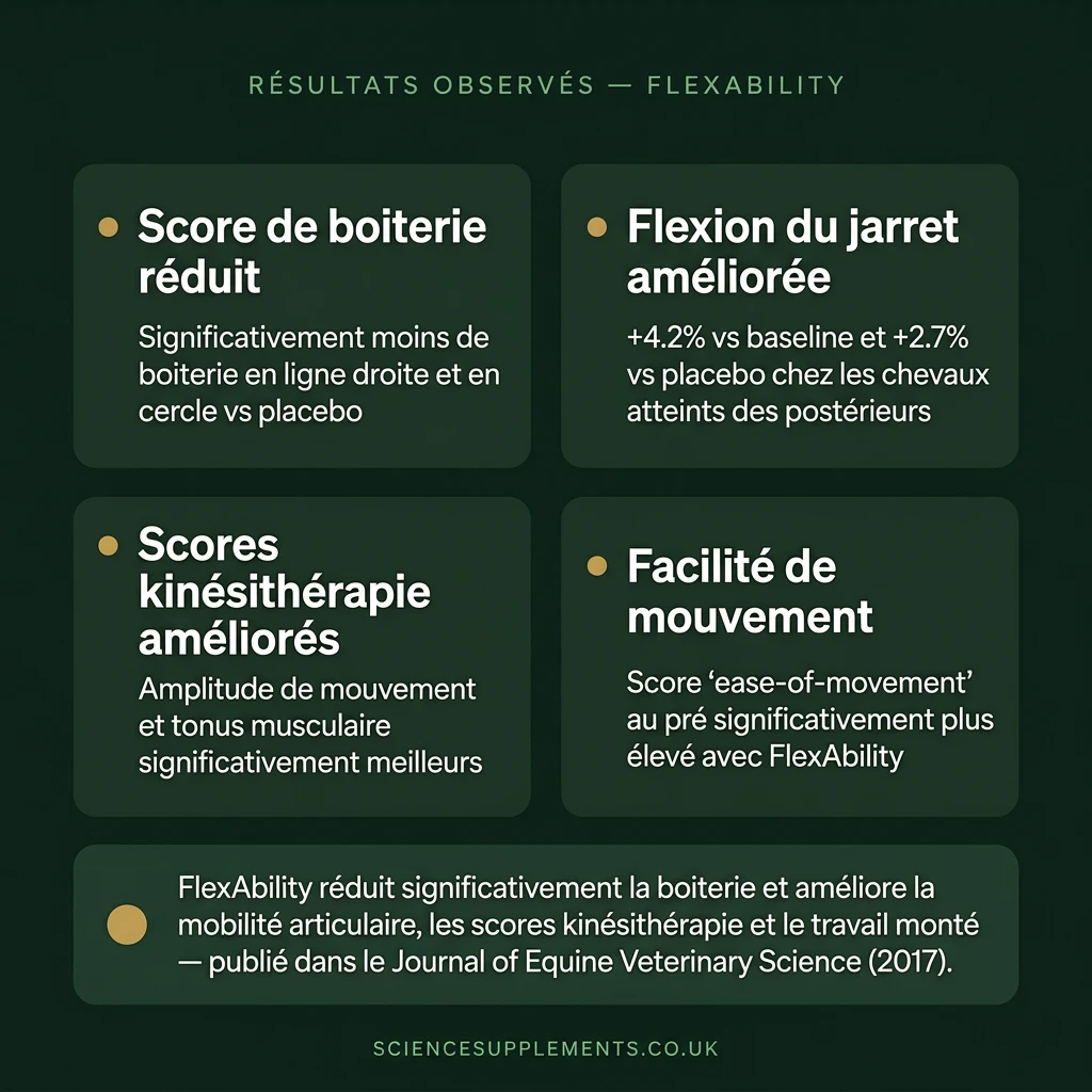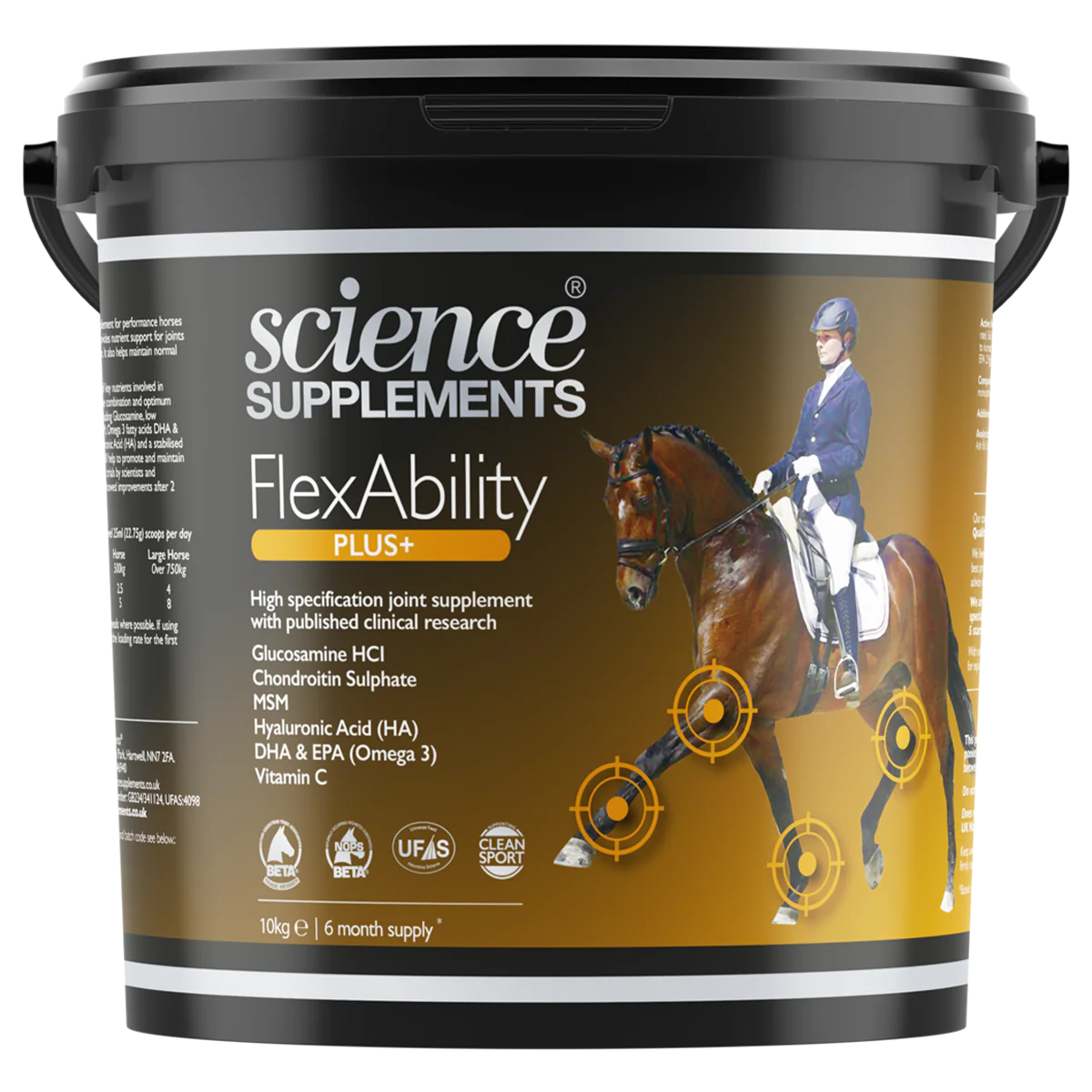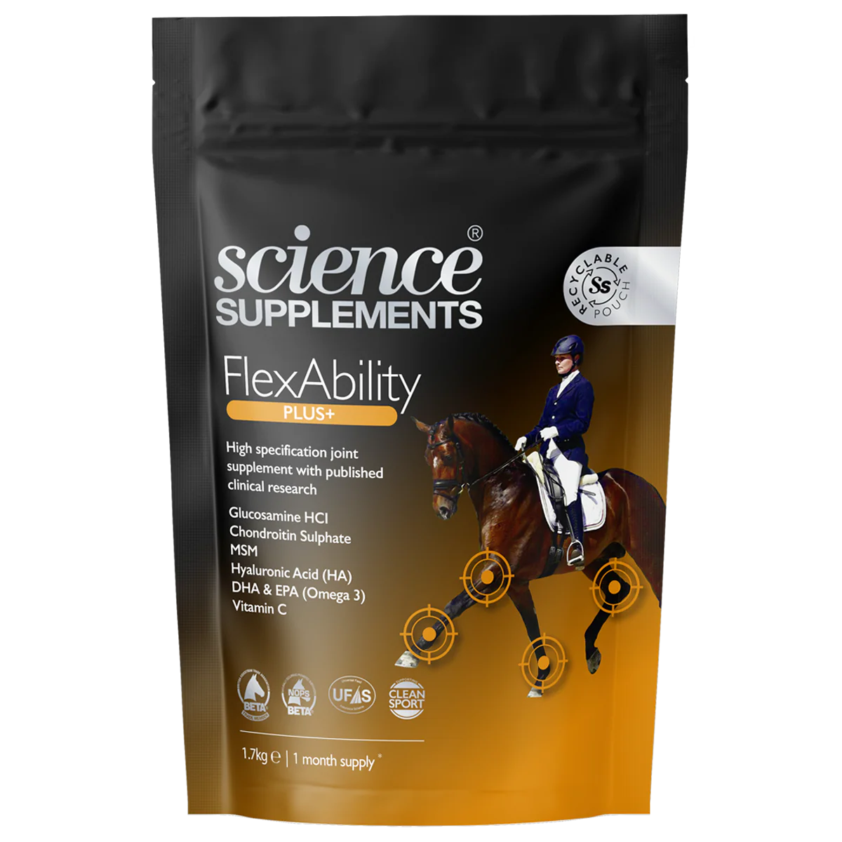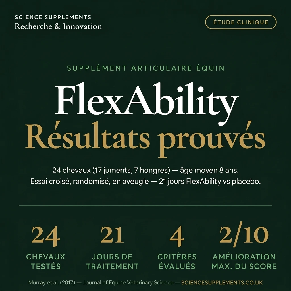 La gamme de compléments articulaires FlexAbility est la gamme de compléments articulaires la plus performante disponible au Royaume-Uni et la seule à avoir fait l'objet de deux études cliniques et scientifiques démontrant les effets positifs de la supplémentation articulaire, dont un article publié et évalué par des pairs dans le Journal of Equine Veterinary Science.