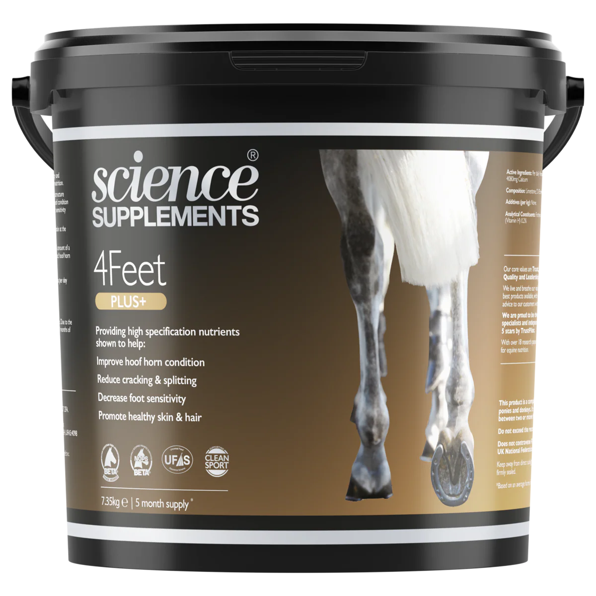 4Feet+ : Solution ultra-résistante pour les sabots les plus difficiles, incluant des probiotiques pour équilibrer la flore intestinale et produire de la biotine naturellement.