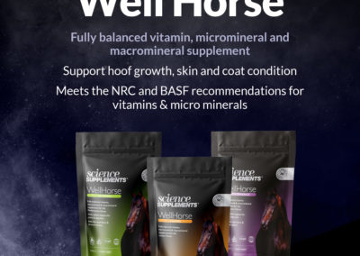 Le Well Horse Veteran est un supplément complet contenant tous les minéraux et vitamines essentiels pour les chevaux, avec des probiotiques pour soutenir la flore intestinale et des chondroprotecteurs pour le soutien articulaire. Il est particulièrement adapté aux chevaux séniors, aux poulains en croissance et à ceux nécessitant un apport supplémentaire en vitamines E et C (ceux n’ayant pas accès à l’herbe ou ayant des problèmes musculaires, myosites ou PSSM, ou encore de l’asthme)